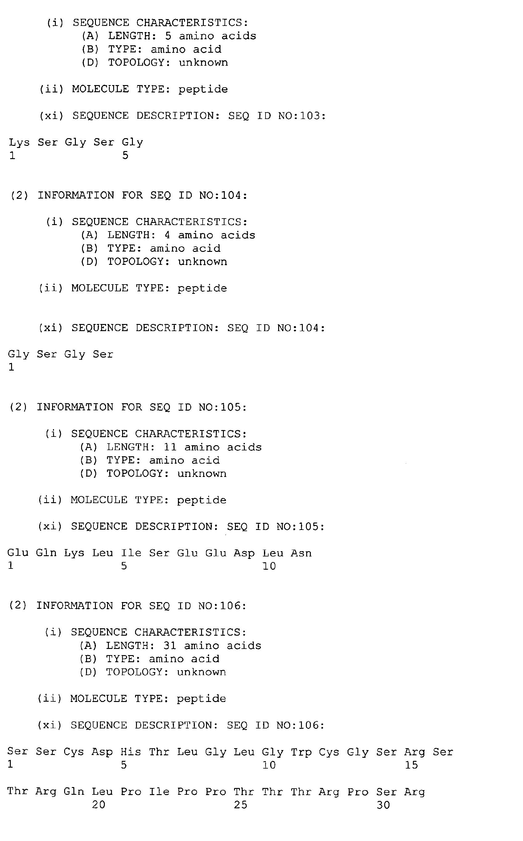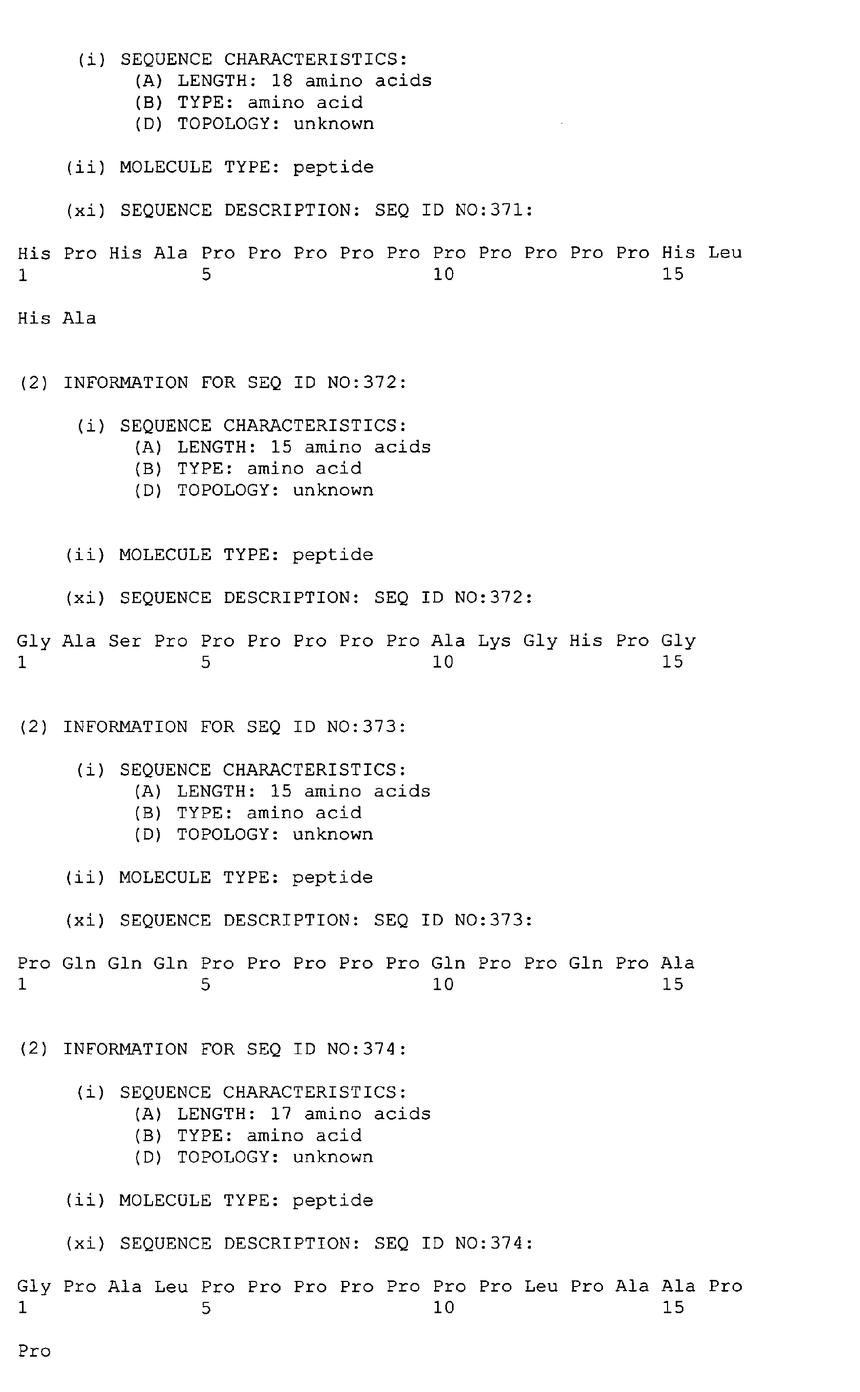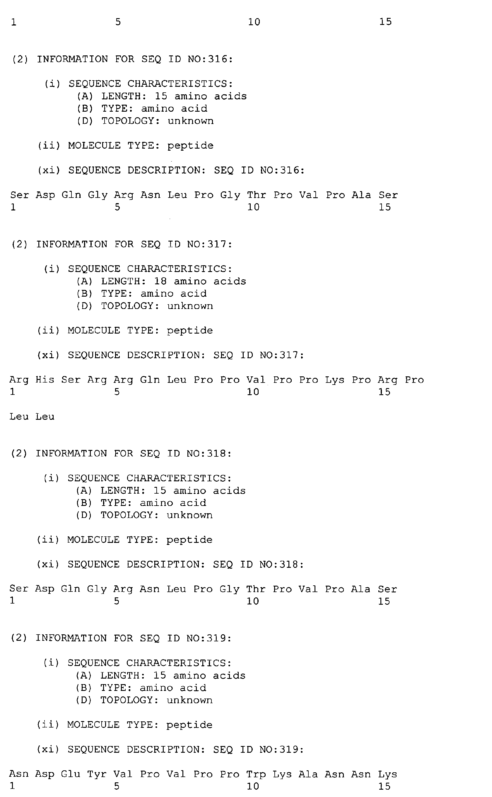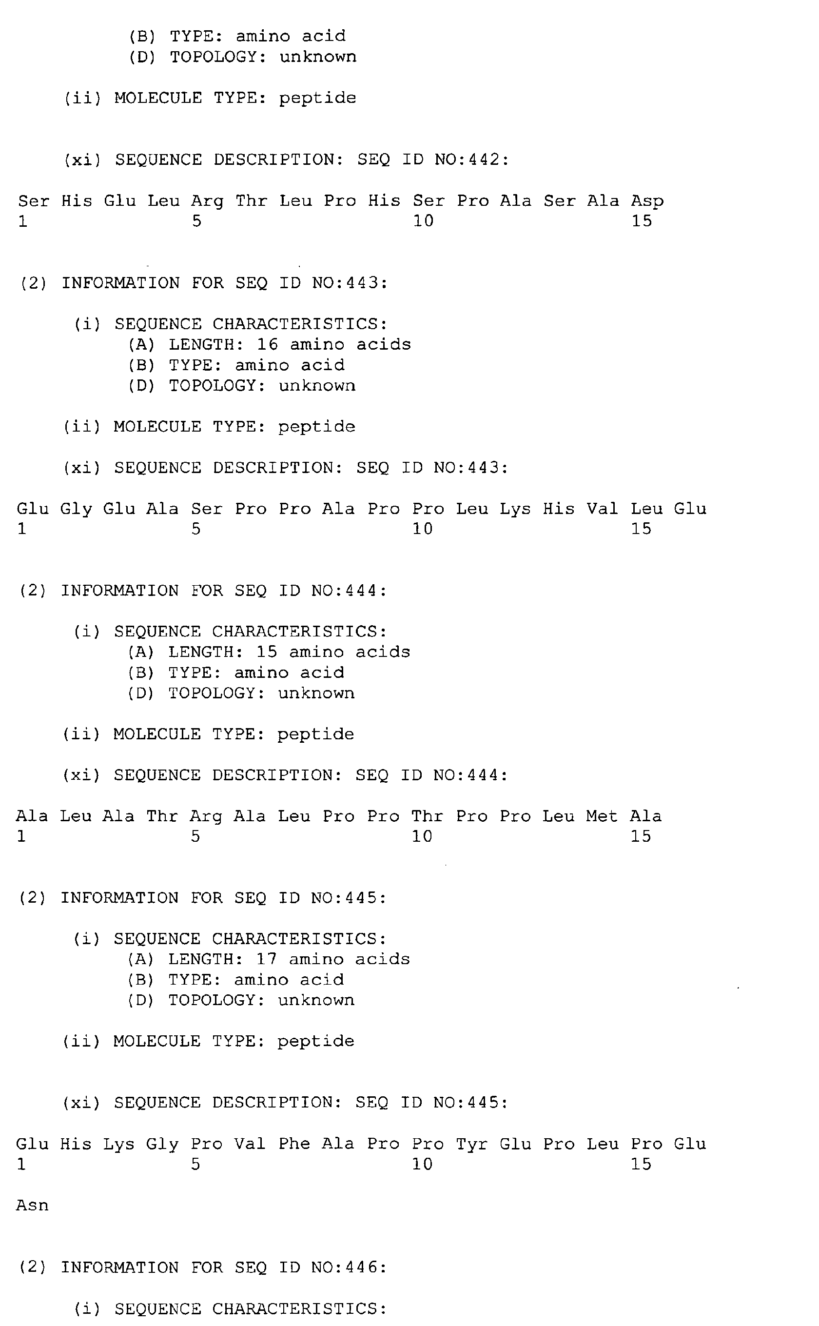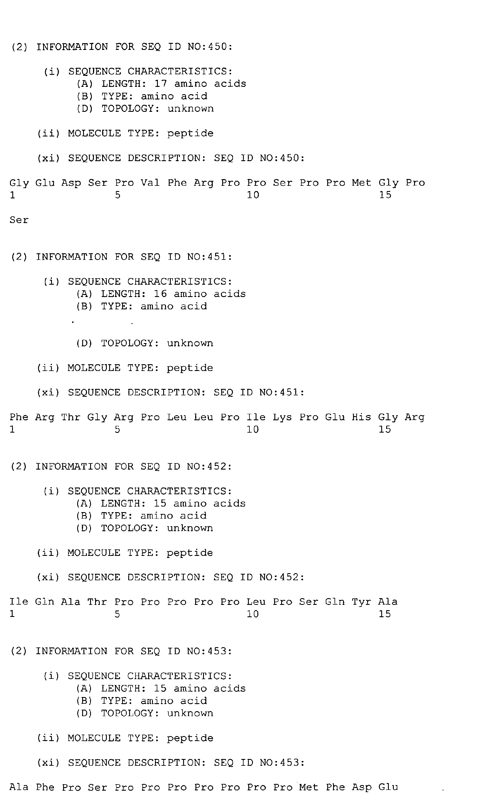 - Yu, et al. (Yu, H., et al., in Cell (1994) 76:933-945) used a "biased" synthetic peptide library of the form XXXPPXPXX (SEQ ID NO:2), wherein X represents any amino acid other than cysteine, to identify a series of peptides which bind the Src and PI-3' Kinase SH3 domains.