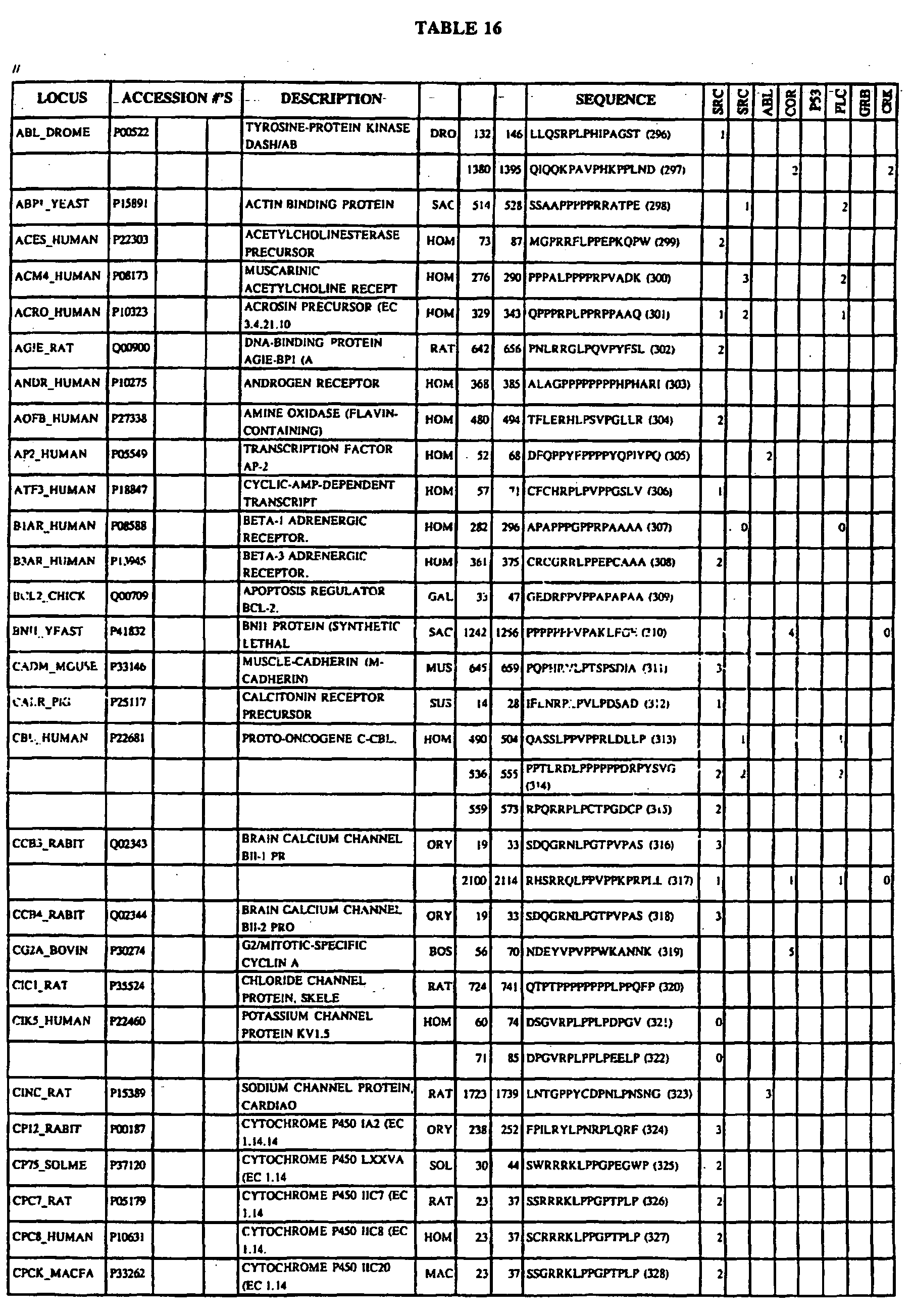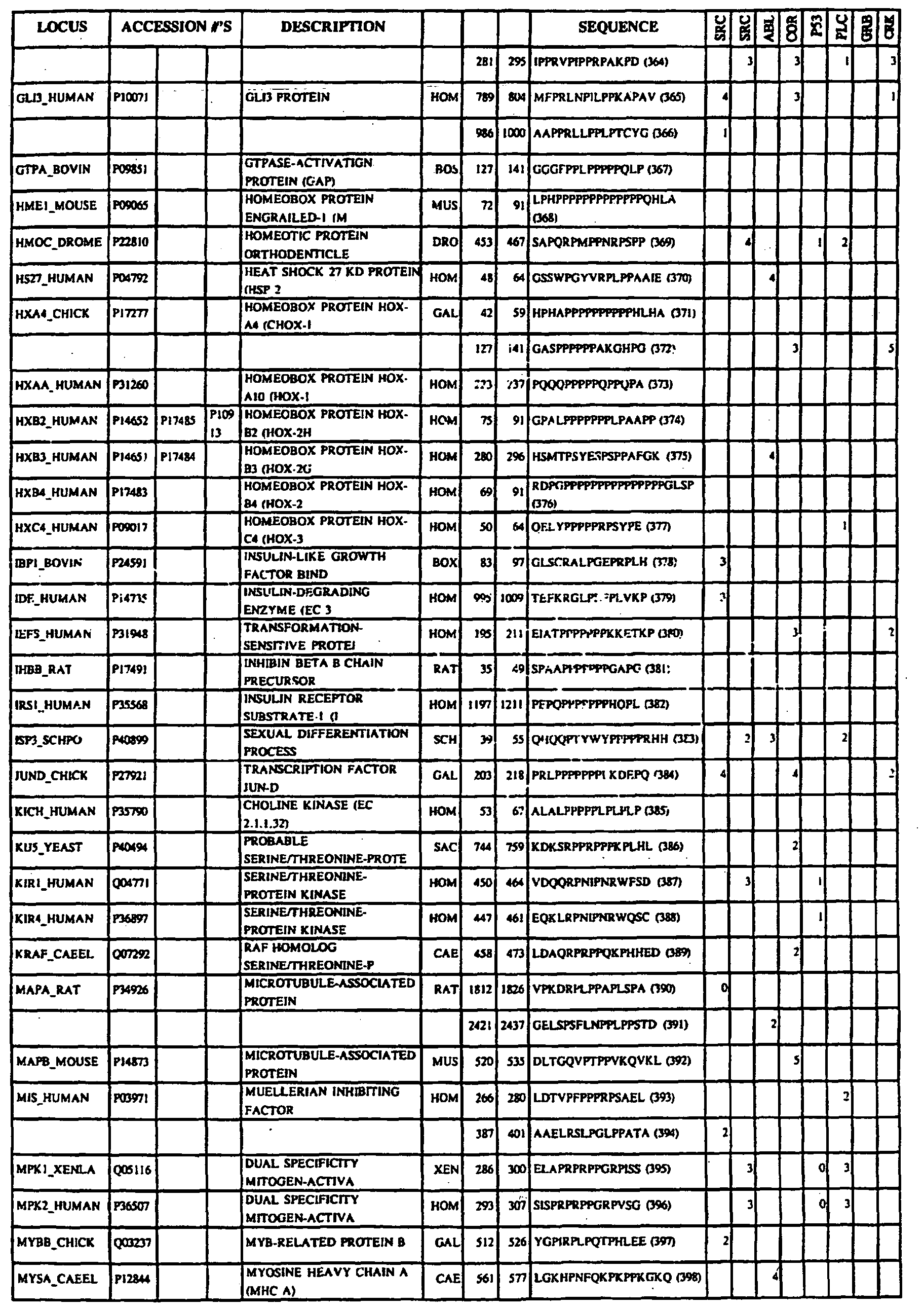 - Some of these protein targets include Abl, Src, Grb2, PLC- ⁇ , PLC- ⁇ , Ras GAP, Nck, and p85 PI-3' Kinase. From the nucleotide sequence of the binding phage, the amino acid sequence of the peptide inserts has been deduced.