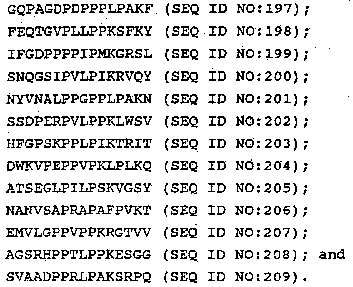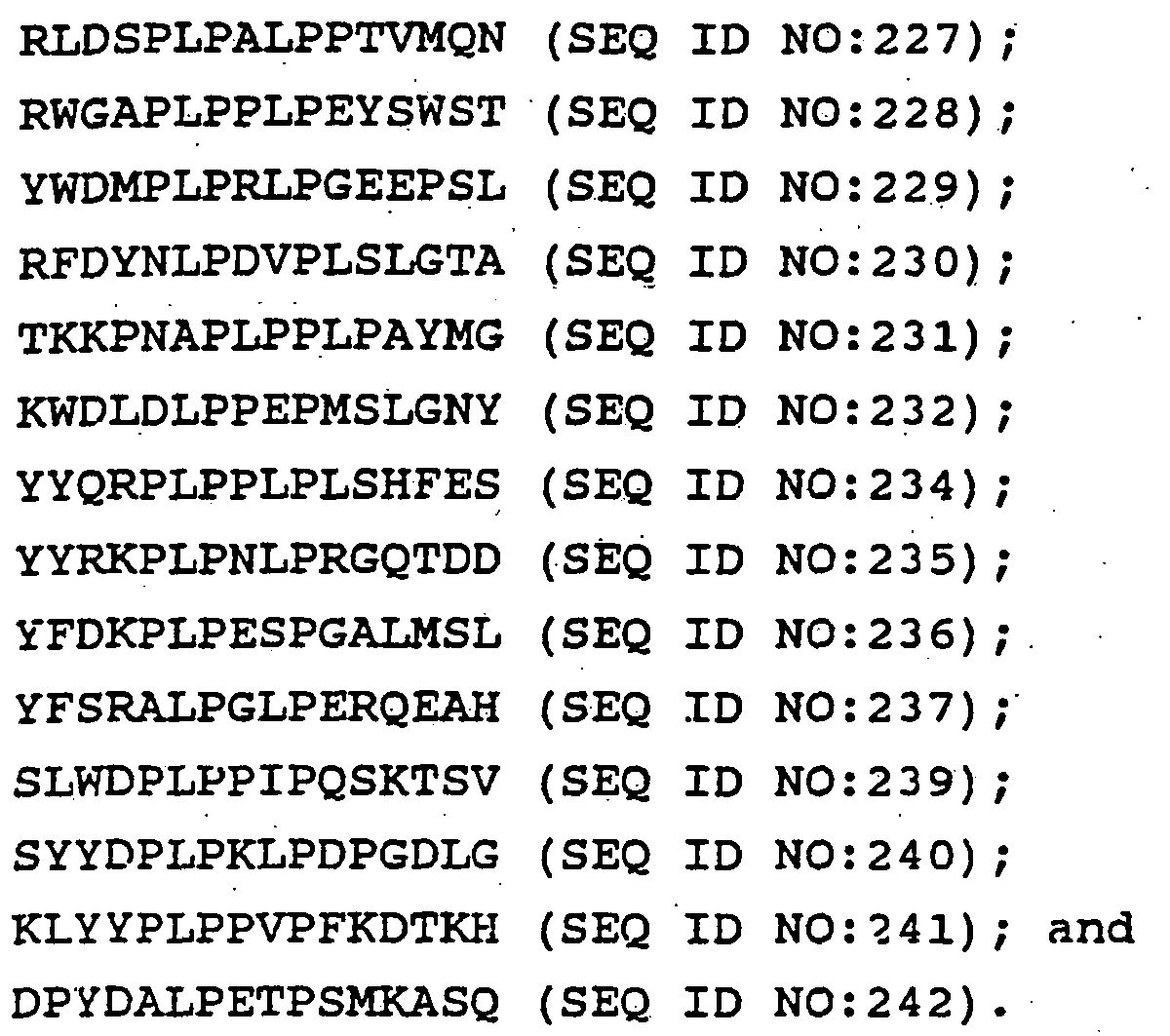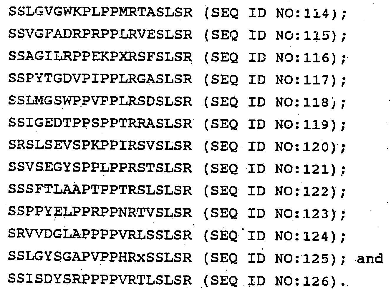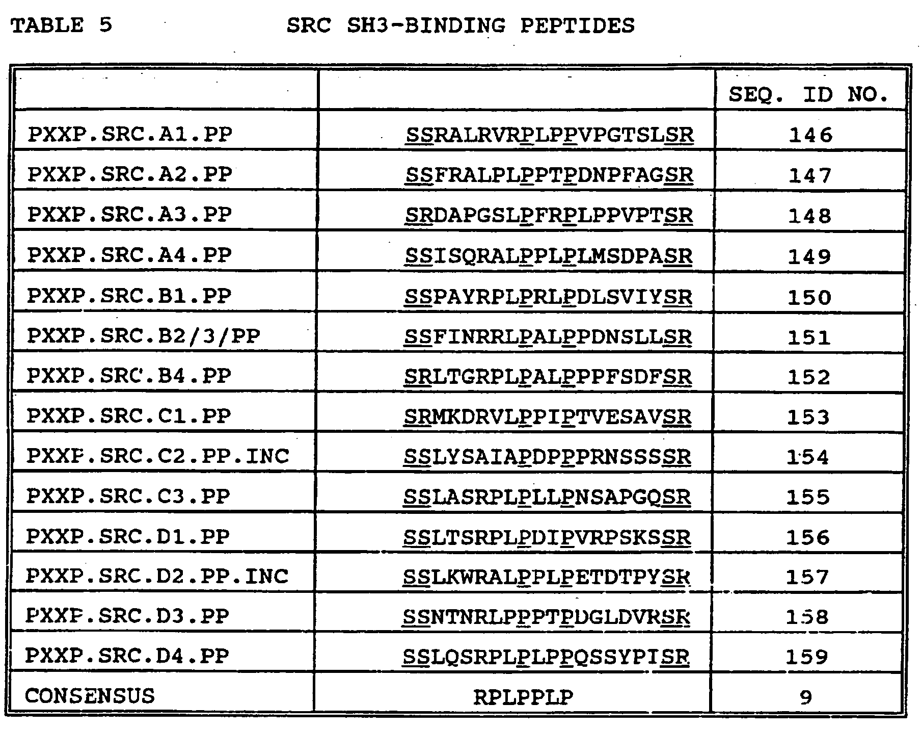 - peptides having at least nine and up to forty-five amino acid residues, including an amino acid sequence of the formula, R-2-L-P-5-6-P-8-9 (SEQ ID NO:10), positioned anywhere along the peptide, in which each number represents an amino acid residue, such that 2 represents any amino acid residue except cysteine, 5 and 6 each represents a hydrophobic amino acid residue, 8 represents any amino acid residue except cysteine, and 9 represents a hydrophilic amino acid residue except cysteine, each letter being the standard one-letter symbol for the corresponding amino acid, said peptide exhibiting a binding affinity for the SH3 domain of Src, provided that said peptide is not R-P-L-P-P-L-P-T-S (SEQ ID NO:11).