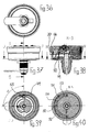- the nose 22 of the locking piece 20 by bevels 39th or 40 of the slotted guide 38 in Figure 25 and 1 upwards Direction moves so that the attachment between the locking piece 20 and the peripheral surfaces of the clutch discs 5 repealed is, with the result that on the multifunction spring 19 provided spring arms over with the clutch discs. 5 connected, preferably designed as heart discs actuators the clutch discs 5 and thus the number wheels 3rd from the set key secret of the combination lock 2 adjust.