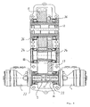 - the transmission according to the invention differs according to Figures 4 and 5 of the previously described by the bearing of the bevel pinion shafts 13 of the hydraulic motors 4. It is clear that the bevel pinion shaft 13 is mounted directly in the transmission housing 1 only with a bearing 31.