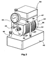 - FIG. 2 is the entire hydraulic unit shown. It can be seen the housing 10 with the longitudinal ribs 12. At one end there is the fan 30, which drives an air flow along the outside of the housing. At the opposite end of the housing is the pump part 40 with the pressure port 41 and the return port 42 on the front side. Further, there is a manometer 43 attached, which indicates the pressure.