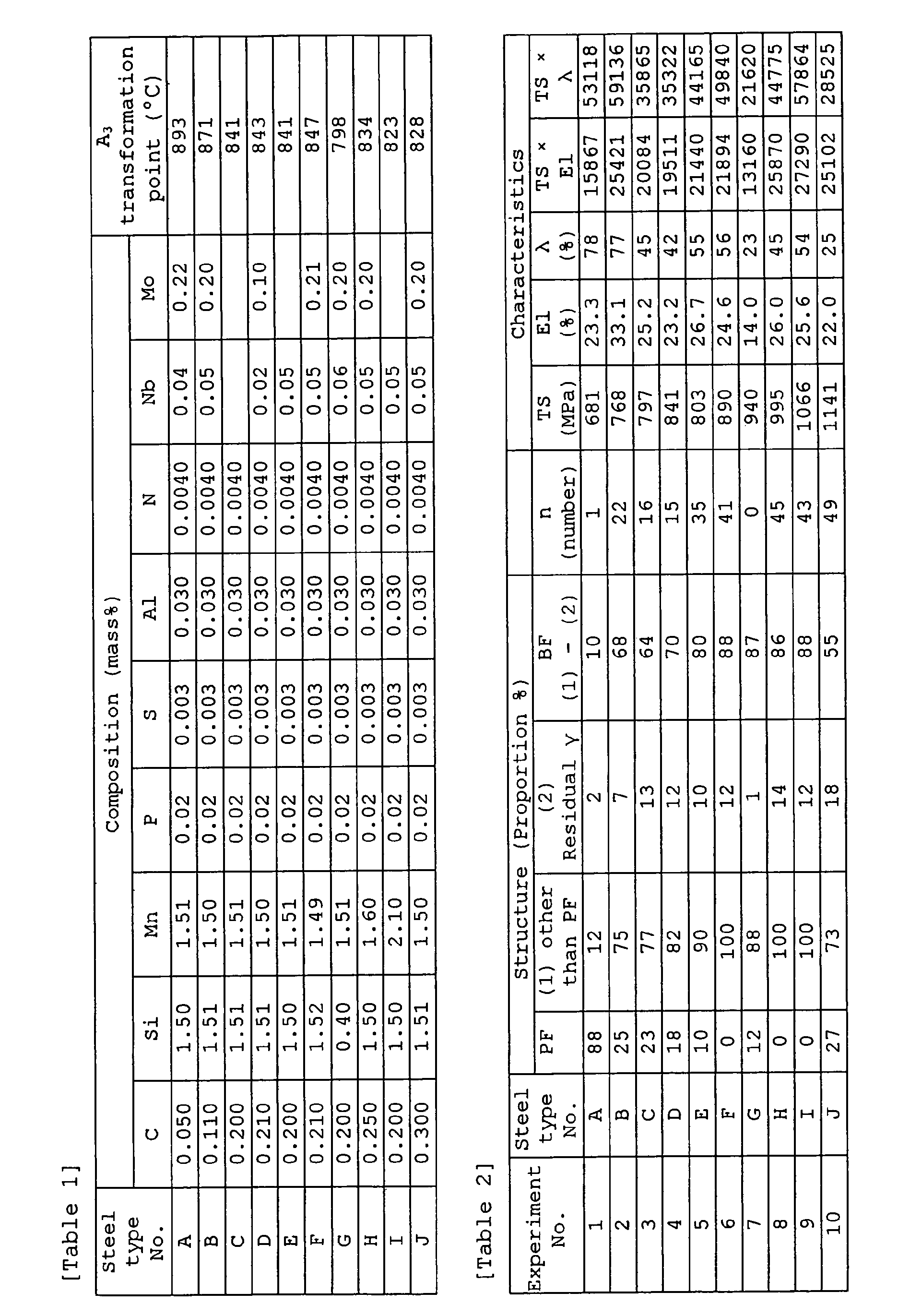 - the present inventors took up the cold rolled steel sheet among steel sheets in consideration of the following actual circumstances. That is, the cold rolled steel sheet has a small thickness and high accuracy of surface quality as compared with a hot rolled sheet and is therefore greatly required as the material for automobile bodies. However, it tends to be inferior in elongation and stretch-flangeability because of small thickness, and thus a cold rolled steel sheet having excellent formability has never been provided.