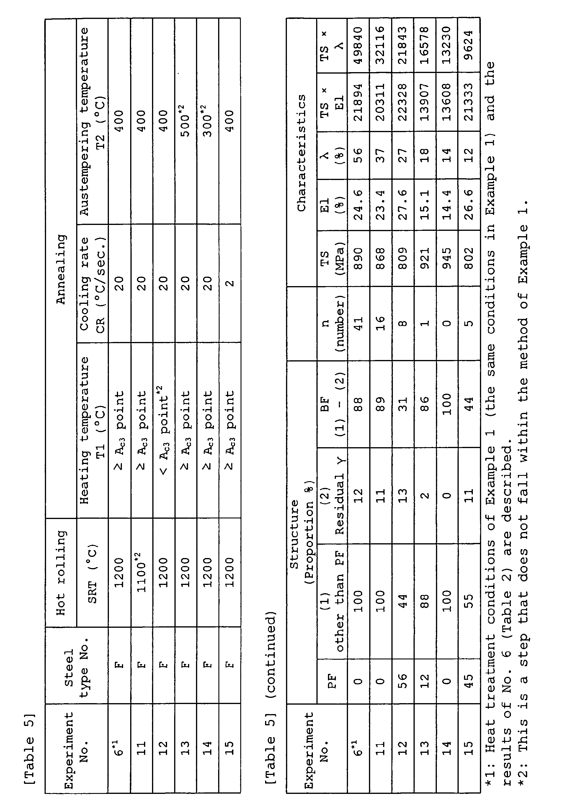 - Specific examples thereof include a method in which a Nb-free steel not containing Nb therein (basic components in the steel satisfy the scope of the present invention) and the hot rolling step is carried out in the same manner as in case of the prior art (therefore, a slab temperature SRT at the starting of hot rolling is controlled within the same range as that in case of the prior art, for example, about 1050 to 1150°C) and also a cold rolling ratio is set to the value more than that in case of the prior art (more than about 75%); a method in which the above Nb-free steel is used and the hot and cold rolling steps are carried out in the same manner as in case of the prior art and also the steel is annealed at lowered austempering temperature for a long time; and a method in which the above Nb-free steel is used and the hot rolling step is carried out in the same manner as in case of the prior art, while the cold rolling ratio is set to a high value and also the steel is annealed at lowered austempering temperature for a