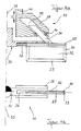 - a milling head 21 of the device 1 is shown in FIGS. 3a and 3b. He includes an immovable cutting element 22 and two movable Cutting elements 23. They each have a foot 24, which in a Rail 25 is held interchangeable with a cutting element holder 26. The rails 25 both of the non-displaceable cutting element 22 as well the displaceable cutting elements 23 extend radially and intersect Therefore, in the axis of rotation of the milling head 21. They are in a right Angle to each other. Each foot 24 of the cutting elements 22, 23 has latches 27, which engage in associated catches 28 in the rails 25 and fix the cutting elements 22, 23 stationary in the milling head 21.