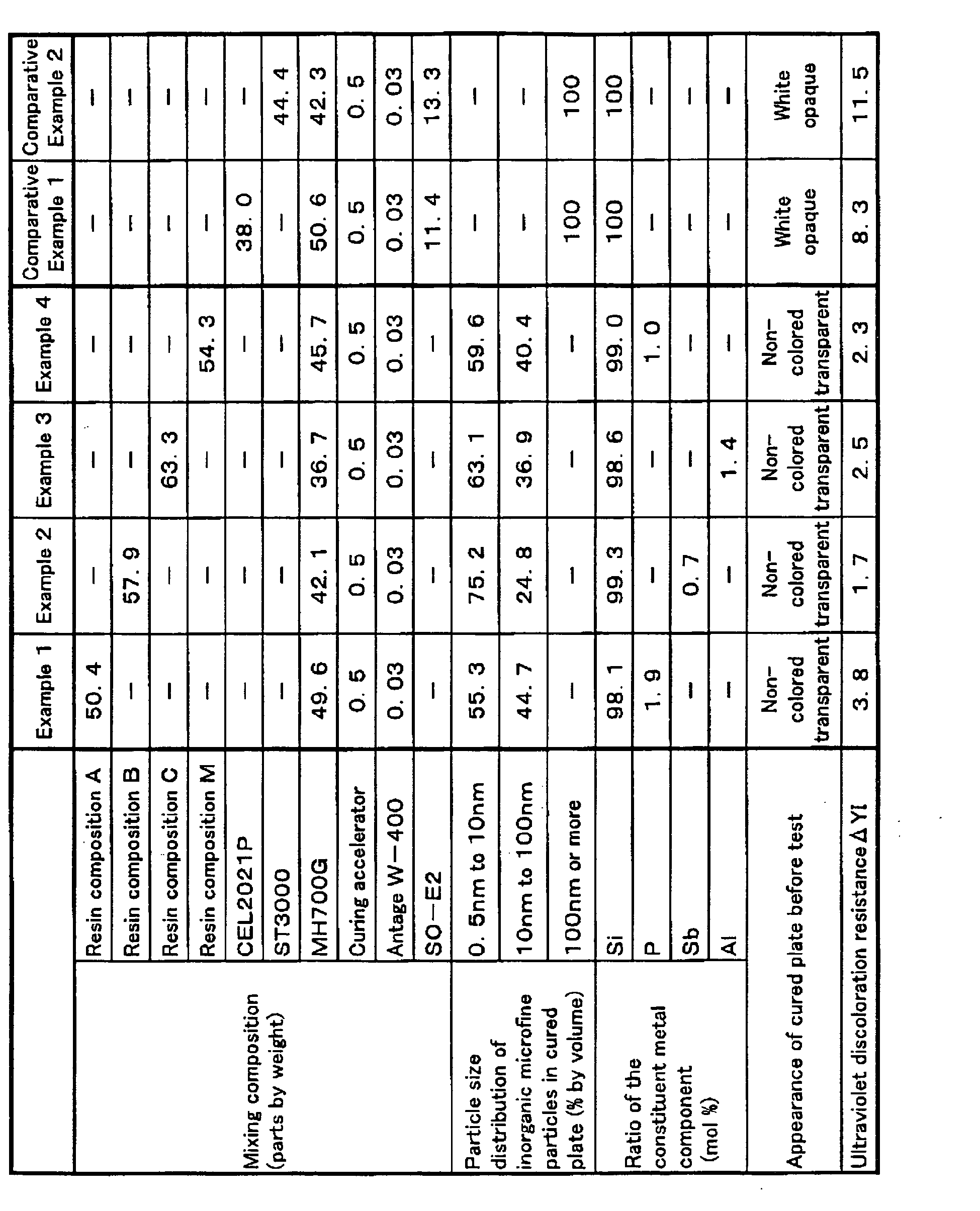 - it is desired to increase the content of inorganic components in order to inhibit degradation of appearance during irradiation of light but if the content of the inorganic components is increased, the transparency is impaired. Therefore, an attempt has been made to achieve compatibility between ensuring of the transparency and inhibition of the deterioration in appearance during irradiation of light by controlling a particle size distribution of the inorganic components in nanoorder.