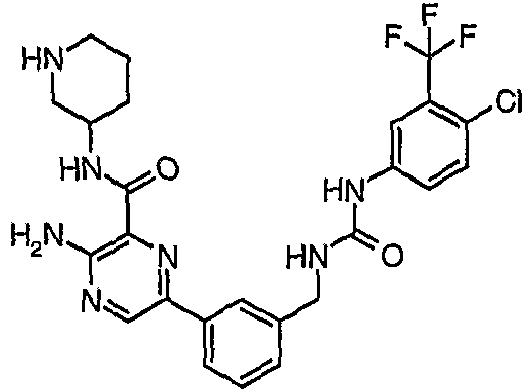 - JARLJIDDGNFZAH-UHFFFAOYSA-N 3-amino-6-[3-[[[4-chloro-3-(trifluoromethyl)phenyl]carbamoylamino]methyl]phenyl]-n-piperidin-3-ylpyrazine-2-carboxamide Chemical compound NC1=NC=C(C=2C=C(CNC(=O)NC=3C=C(C(Cl)=CC=3)C(F)(F)F)C=CC=2)N=C1C(=O)NC1CCCNC1 JARLJIDDGNFZAH-UHFFFAOYSA-N 0.000 claims description 4