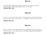 - TCRs of the invention comprising the variable domain combinations detailed above further comprise the alpha chain constant region amino acid sequence shown in Figure 8a (SEQ ID NO: 100) and one of the beta chain amino acid constant region sequences shown in Figures 8b and 8c (SEQ ID NOs: 101 and 102) or phenotypically silent variants thereof.