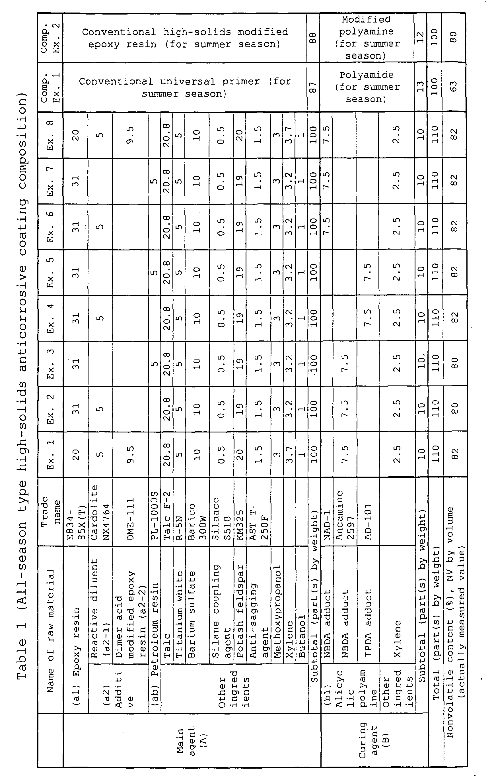 - This high-solids anticorrosion paint has a solids content of about 80% by weight and has a solvent content of about 20% by weight, so that it has excellent low-solvent-content property and is useful as a countermeasure to the VOC regulation.