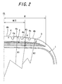 numeral 1 is a carcass comprised of at least one carcass ply toroidally extending between a pair of bead cores (not shown), andnumeral 2 is a main belt disposed on a crown portion radially outer peripheral face of a crown portion of thecarcass 1. Themain belt 2 may be comprised of at least two belt layers formed by spirally winding a rubberized inextensible high-rigidity cord(s) (Kevlar cord may be applied). - Also,