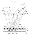 - the hologram array 55 comprises micro-holograms 55' which are arranged in an array form at the same pitch as that of R, G, and B spectral pixels, corresponding to the period of repetition of R, G, and B spectral pixels, i.e., sets of liquid crystal cells 56', each including three adjoining liquid crystal cells 56' of the liquid crystal display element 6 as viewed in a plane direction of the drawing sheet.