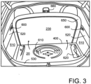 - the second upper set of side panels 520 includes the aforementioned integrally molded clips near edges of the second upper set of side panels 520 abutting onto the rear row of seats 110; the clips are denoted by 600.