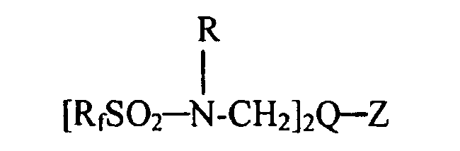 - the present invention provides a monomeric surfactant including one or more compounds of the formula I wherein R f is a C 2 -C 5 perfluoroalkyl group; R is a C 1 -C 4 alkyl or aryl group; Q is a divalent linking group selected from -CHO-, -CHO(C n H 2n )-, -CHO(C n H 2n O) p (C n H 2n )-, -CHS-, -CHS(C n H 2n )-, -CHS(C n H 2n O) p (C n H 2n ) and -CHOC(O)(C n H 2n )-, in which p is an integer from 1 to 50; Z is COO - M + SO 3 - M + , -N + (R) 3 Y - , -N + (R) 2 O - , -N + (R) 2 -(CH 2 ) n COO