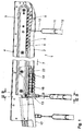 - This pressure-rail 29 is provided with a run-up edge 30 extending obliquely to the conveying direction 7 and is resiliently pressed outwards in the direction of the bracket contact surface 28 by means of a compression spring 31 arranged in the transport rod 2.