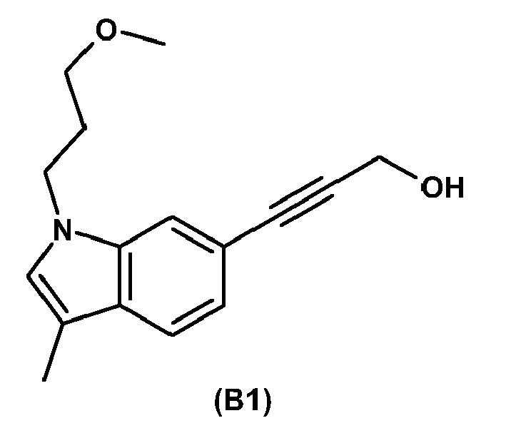 Ein getrocknetes 10 ml Schlenk-Rohr wird unter Argon Atmosphäre mit einer Lösung von 1.00 mmol 3-[1-(3-Methoxy-propyl)-3-methyl-1 H-indol-6-yl]-prop-2-in-1-ol in 2.5 ml Tetrahydrofuran befüllt. Die Lösung wird mit 0.10 mmol festem Kupfer(I) iodid versetzt und die Suspension wird auf-10°C abgekühlt. Anschliessend werden 1.25 ml einer 2.0 molaren Isopropylmagnesiumchlorid-Lösung in Diethylether zugegeben. Die entstehende Mischung wird während 18 Stunden bei -18°C gerührt. Dann wird das Reaktionsgemisch auf gesättigte, wässrige Ammoniumchlorid-Lösung bei 0°C gegossen und anschliessend mit Wasser und Essigester verdünnt. Die Phasen werden getrennt, die wässrige Phase wird mit Essigester (2 x) extrahiert. Die vereinigten organischen Phasen werden mit Sole gewaschen, mit Natriumsulfat getrocknet, filtriert und am Rotationsverdampfer eingedampft. Aus dem Rückstand wird mittels Flashchromatographie (SiO2 60F, Essigester-Hexan 2:1) die Titelverbindung B2 als gelbes Oel erhalten (214 mg). Rf = 0.45 (Essigester-Heptan 2:1); Rt = 4.84 (Gradient I).A dried 10 ml Schlenk tube is added under argon atmosphere with a solution of 1.00 mmol of 3- [1- (3-methoxy-propyl) -3-methyl-1H-indol-6-yl] -prop-2-yne. 1-ol in 2.5 ml of tetrahydrofuran. The solution is treated with 0.10 mmol of solid copper (I) iodide and the suspension is cooled to -10 ° C. Subsequently, 1.25 ml of a 2.0 molar solution of isopropylmagnesium chloride in diethyl ether are added. The resulting mixture is stirred for 18 hours at -18 ° C. Then, the reaction mixture is poured onto saturated aqueous ammonium chloride solution at 0 ° C and then diluted with water and ethyl acetate. The phases are separated, the aqueous phase is extracted with ethyl acetate (2 ×). The combined organic phases are washed with brine, dried with sodium sulfate, filtered and evaporated on a rotary evaporator. From the residue is obtained by flash chromatography (SiO 2 60F, ethyl acetate-hexane 2: 1) the title compound B2 as a yellow oil (214 mg). Rf = 0.45 (ethyl acetate-heptane 2: 1); Rt = 4.84 (gradient I).