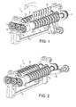 - Two parallel lines of toothed wheels 3, 4 are mounted on respective shafts 5, 6 rotatable in the frame about spaced horizontal axes.