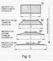 - Each chablon cylinder 105 is inked by its associated inking device 106 and carries one chablon plate with raised portions corresponding to selected areas to be inked on the plate cylinder 103 in the desired colour.
