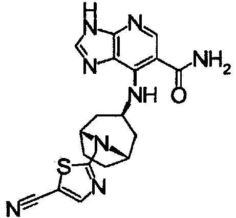 - a pyrrolopyrimidine derivative (refer to patient literature 3, patent literature 4, patent literature 5, and patent literature 6) represented by formula (C) is also known as a compound having JAK3 inhibition activity. (For the symbols in the formula, refer to the corresponding patent publications.)