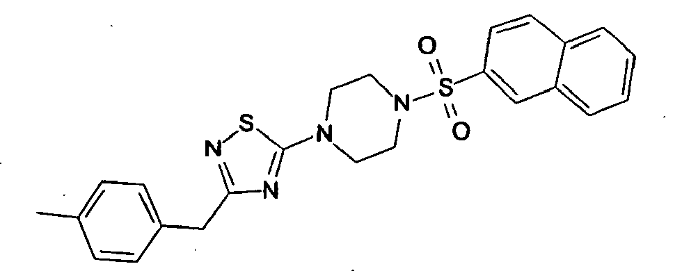 - JCROPKNMTWZFMR-UHFFFAOYSA-N 5-[4-(4-methoxyphenyl)sulfonyl-3-methylpiperazin-1-yl]-3-[(4-methylphenyl)methyl]-1,2,4-thiadiazole Chemical compound C1=CC(OC)=CC=C1S(=O)(=O)N1C(C)CN(C=2SN=C(CC=3C=CC(C)=CC=3)N=2)CC1 JCROPKNMTWZFMR-UHFFFAOYSA-N 0.000 claims description 5