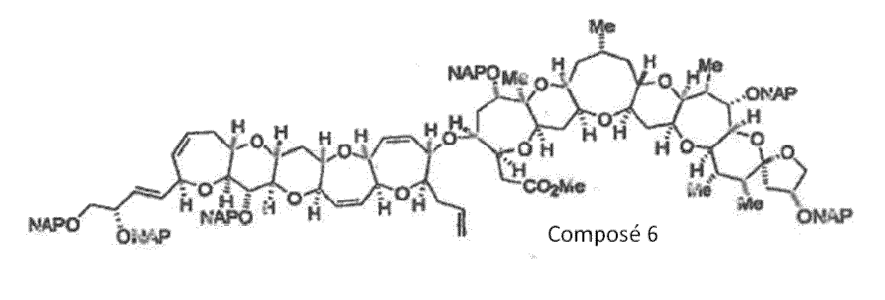 une double liaison du composé A est oxydée par du tétraoxyde d'osmium et transformée en dérivé diol de composé A, le diol est transformé en aldéhyde par clivage par oxydation par du periodate de sodium, puis l'aldéhyde est réduit en alcool en utilisant du borohydrure de sodium pour obtenir le composé 1 (procédé 1), l'alcool du composé 1 est transformé en composé 2 en utilisant de la tributylphosphine de diphénylsulfure (procédé 2) ledit composé 2 est transformé en α-chlorosulfure en utilisant de la N-chlorosuccinimide pour synthétiser le composé B, en présence de DTBMP ledit composé B est assemblé aux segments cycliques ABCDE du composé C, sous forme de O,S-acétal en utilisant du triflate d'argent et le composé 3 est formé (procédé 3), le groupe TIPS dudit composé 3 est éliminé en utilisant du TBAF pour former le composé 4 (procédé 4) du pentafluorophénylpropiolate est assemblé à l'alcool dudit composé 4 en utilisant de la triméthylphosphine et le composé 5 est formé (procédé 5), conduire une réaction de cyclisation radicalaire sur ledit composé 5 par traitement avec de l'AIBN et de l'hydrure de tributyl-étain pour former la partie cyclique G, de sorte que le composé 5 se transforme en acide carboxylique du composé D, puis se transforme en ester méthylique par l'action de triméthylsilyldiazométhane et forme le composé 6 (procédé 6), forme le composé 7 (procédé 7) par réduction de l'ester méthylique dudit composé 6 par du diisobutylaluminium hydraté sous des conditions de basse température, puis se transforme en oléfine par réaction de Wittig, forme le composé 8 (procédé 8) par formation de la partie cyclique F par conduite d'une réaction de métathèse par fermeture de cycle par action d'un catalyseur de Grubbs sur ledit composé 7, synthétise le composé E, le 1,2-diol de la chaîne latérale du cycle A qui est protégée par du naphtylacétal, par oxydation des groupes 6 NAP en utilisant du DDQ et en éliminant les groupes 5-NAP (procédé 9), puis effectuer un traitement acide sur ledit composé E (procédé 10),