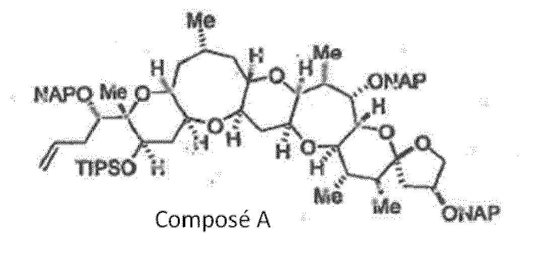 dans lequel, dans les composés A, B, D, E, CTX1B et les composés 1 à 8, NAP est le groupe 2-naphtylméthyle, Me est le groupe méthyle, TIPS est un groupe triisopropylsilyle, Ph est le groupe phényle, de plus, l'abréviation DTBMP est la 2,6-di-butyl-4-méthylpyridine, TBAF est le fluorure de tétrabutylammonium,