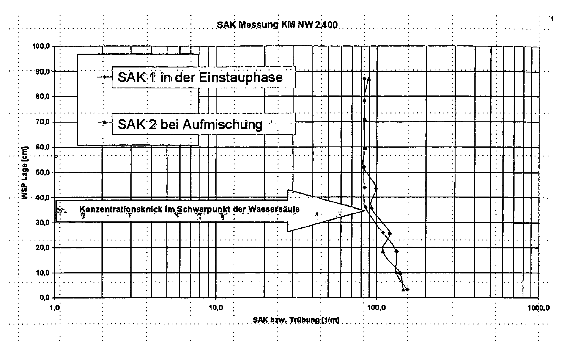 Die schichtweise Messung von Abwasserinhaltsstoffen in eingestauten Abwasserkörpern wurde zur Auswertung der Schmutzfrachtentlastung an der Entlastungswehranlage des Stauraumkanales in Burscheid Luisental, anlässlich des Forschungsvorhabens {1} mittels einer SAK Sonde, die fest auf der Wehrkante befestigt war, vorgenommen. Diese technische Umsetzung entspricht einem Detailaspekt der Beschreibung gemäßDE-A-4016378 . Auf Grund eigener Messungen von "Schichtkonzentrationen SAK Messung KM NW 2400" {2}, hat der Unterzeichner festgestellt, dass nach längeren Einstauzeiten, eine Qualitätsschichtung derart auftritt, die im oberen 2/3 *h[WSP] Bereich des Abwasserkörpers nahezu konstant ist und unterhalb des Konzentrationsknickes von ca. 1/3 *h[WSP]; hier ca. 36 cm, in Richtung Sohlbereich [WSP = 0] stetig zunimmt. -