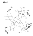 - the receiver 10 is positioned, as shown in Fig. 2 , at the intersecting point 31 of a sphere (circle) 21a having a radius equal to the distance a and being centered at the position of the GPS satellite 20a and spheres (circles) 21b to 21d of the GPS satellites 20b to 20d, formed in the same manner as the sphere 21 a.