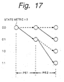 - a transition diagram (hereinbelow, referred to as a trellis) as shown in Fig. 2 which is formed on the basis of an encoding method by the encoder on the transmission side is used as a prerequisite and, for example, a path whose hamming distance from a received code series is the shortest is selected as a maximum likelihood path from the transitions which can occur on the transition diagram.