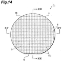 - the silicon wafer 11 illustrated in Fig. 12 has a thickness of 350 ⁇ m, the molten processed region 13 caused by multiphoton absorption is formed near the center of the silicon wafer 11, i.e., at a part distanced from the front face by 175 ⁇ m.