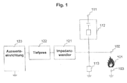 - a low-pass filter 122 which is connected on the output side to an evaluation device 123, is connected to the measuring electrode 102 via a voltage-impedance converter 121. With the aid of this circuit, the resistance of the ionization path between the electrode 102 and the electrode 103 can be determined. Because of this resistance conclusions can be drawn on the flame 101 and thus on the parameters of the combustion process.