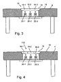 - Figs. 6, 7, 8 show the principle of the pad printing procedure, where Fig. 6 shows inking a print image on a printing block, Fig. 7 shows the ink transfer of the print image from the printing block to a pad and Fig. 8 the transfer of the print image from the pad to a workpiece to be printed.