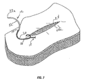 - the surface features 14 permit movement of device 10 through tissue in the direction of movement of a needle end 22 but are generally rigid in an opposite direction and prevent movement of device 10 in a direction opposite the direction of movement of a needle end 22.