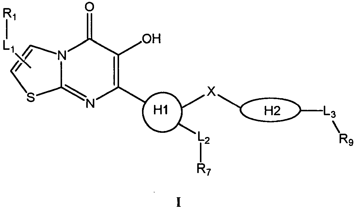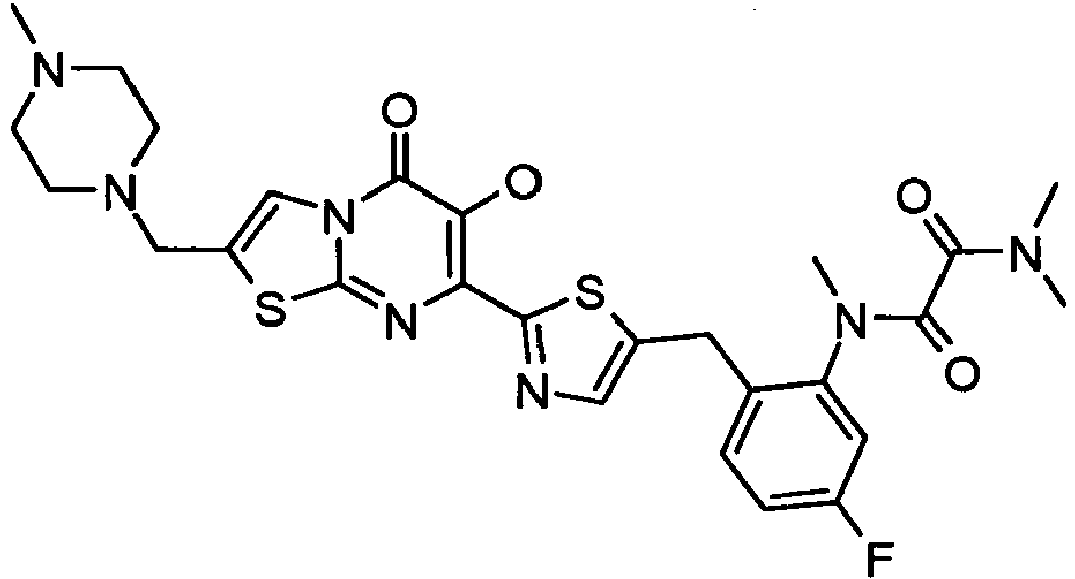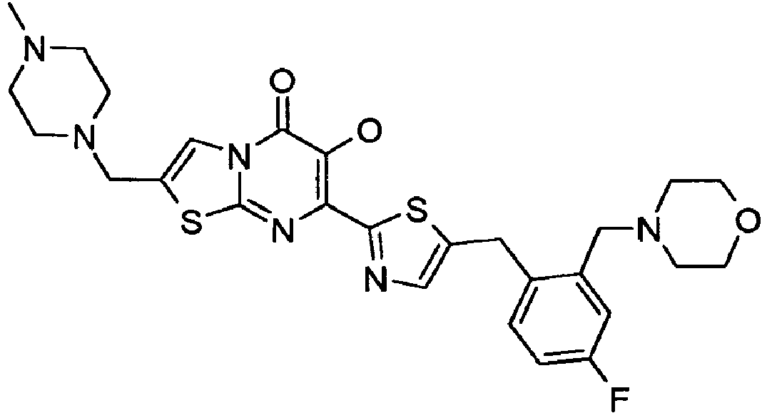 - the compound is selected from the group consisting of: 7-[5-(4-Fluoro-benzyl)-thiazol-2-yl]-6-hydroxy-2-morpholin-4-ylmethyl-thiazolo[3,2-a]pyrimidin-5-one 7-[5-(3-Chloro-4-fluoro-benzyl)-thiazol-2-yl]-6-hydroxy-2-morpholin-4-ylmethyl-thiazolo[3,2-a]pyrimidin-5-one 7-[5-(3,4-Difluoro-benzyl)-thiazol-2-yl]-6-hydroxy-2-morpholin-4-ylmethyl-thiazolo[3,2-a]pyrimidin-5-one 5-Fluoro-2-[2-(6-hydroxy-2-morpholin-4-ylmethyl-5-oxo-5H-thiazolo[3,2-a]pyrimidin-7-yl)-thiazol-5-ylmethyl]-N,N-dimethyl-benzamide 7-