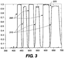 - the guard band has a bandwidth sufficient to remove crosstalk of spectrally separated images viewed through the glasses, and, for example, is calculated based on an amount of wavelength shift occurring when viewing portions of the spectrally separated images at an angle through the filters.