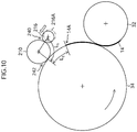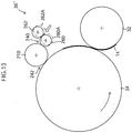 - the transfer drums 32, 42, 52, 62 and the pressure drums 34, 44, 54, 64 which have gripped the leading end portion of a recording medium 14 by means of the grippers 80A and 80B rotate in a prescribed rotation, the recording medium 14 is rotated and conveyed following the outer circumferential surface of the transfer drums 32, 42, 52, 62 and the pressure drums 34, 44, 54, 64.