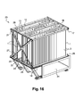 - Module filtrant (23) selon la revendication 11, caractérisé en ce qu'il comporte deux éléments de renforcement comprenant chacun des poutres (27) agencées en croix et s'étendant en travers des extrémités des panneaux (1) sur deux faces latérales verticales du module (23).