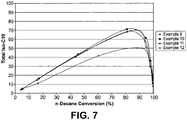 - Figures 6 and 7 show the decane isomerization performance of the catalysts from Examples 9, 10, 11 and 12.