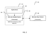 - FIG. 2 at 200 provides a system diagram according to embodiments of the present invention, in which an 802.16 MS 220 and applications 230 are collocated in a mobile user terminal 210, such as, but not limited to mobile phone, laptop, PDA etc.