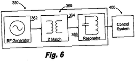 - the inductive circuitry 360 of the primary module 350 preferably includes an RF generator 362 coupled to a Z-Match circuit 364 coupled to a primary resonator coil 366.