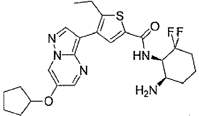 - NGFGTMFVWSDFPS-AWKYBWMHSA-N Cc([s]c(C(N[C@H](C(CCC1)N)C1(F)F)=O)c1)c1-c1c2ncc(Cl)c[n]2nc1 Chemical compound Cc([s]c(C(N[C@H](C(CCC1)N)C1(F)F)=O)c1)c1-c1c2ncc(Cl)c[n]2nc1 NGFGTMFVWSDFPS-AWKYBWMHSA-N 0.000 description 1