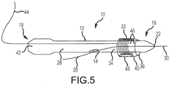 - the "over the wire” method device 12 is mounted over the guide wire 26, the guide wire 26 extending inside device 12 throughout its length. As the distal end 16 of device 12 and the distal end of the guide wire 26 are located inside the body, the operator advances device 12 over the guide wire 26 by pushing device 12 from its proximal end 18, which is outside the patient's body.