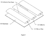 - non-woven composite 102 comprises multiple fibers 111 in parallel with each other. The fibers 111 are enclosed by adhesive 112 that forms a cover. Furthermore, fibers 111 of non-woven composite 102 are arranged such that spaces form that are adhesive-free zones 120.