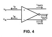 - the exemplary amplifier may take the form of (a) a differential amplifier circuit with an input stage that accepts the first and second voltage inputs and a first output stage that provides the first current output, and (b) a second output stage that provides the second current output, which has substantially the sameamplitude and substantially the same polarity as the first current output.