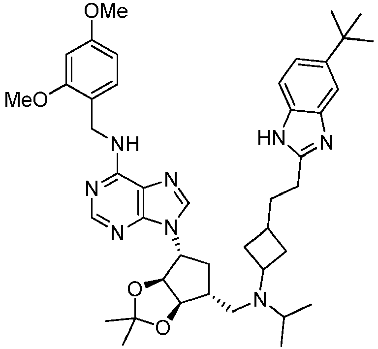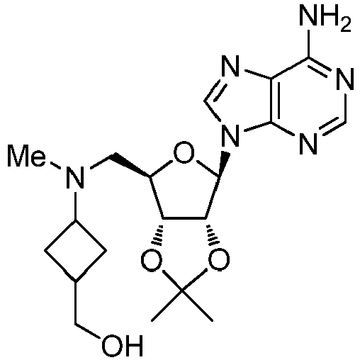 - HPEGFHQWCJDFPK-OXGNPAPVSA-N CC1(C)O[C@H]2[C@H]([n]3c(ncnc4N)c4nc3)O[C@H](CNC3CC(CCC(OCc4ccccc4)=O)C3)[C@H]2O1 Chemical compound CC1(C)O[C@H]2[C@H]([n]3c(ncnc4N)c4nc3)O[C@H](CNC3CC(CCC(OCc4ccccc4)=O)C3)[C@H]2O1 HPEGFHQWCJDFPK-OXGNPAPVSA-N 0.000 description 1
