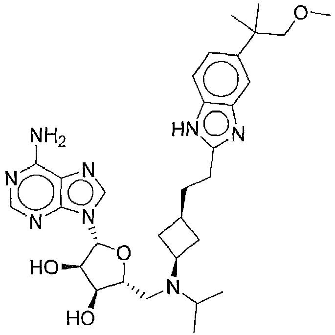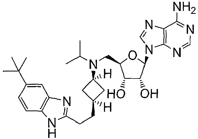 - SVWBPWQRZXBQEN-FJMQSTSNSA-N CC(C)N(C[C@@H](C[C@H]([C@@H]1O)[n]2c3ncnc(N)c3nc2)[C@H]1O)C1CC(CCc2nc(cc(C(C)(C)C)cc3)c3[nH]2)C1 Chemical compound CC(C)N(C[C@@H](C[C@H]([C@@H]1O)[n]2c3ncnc(N)c3nc2)[C@H]1O)C1CC(CCc2nc(cc(C(C)(C)C)cc3)c3[nH]2)C1 SVWBPWQRZXBQEN-FJMQSTSNSA-N 0.000 description 1