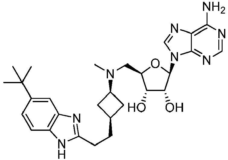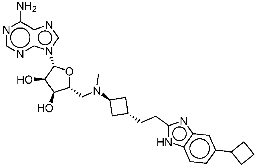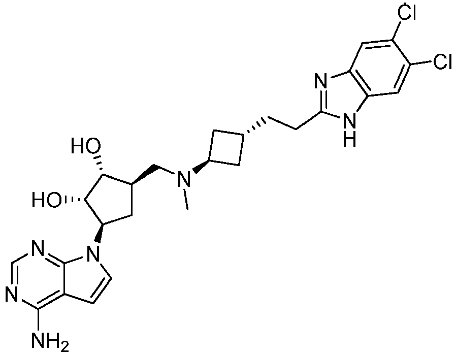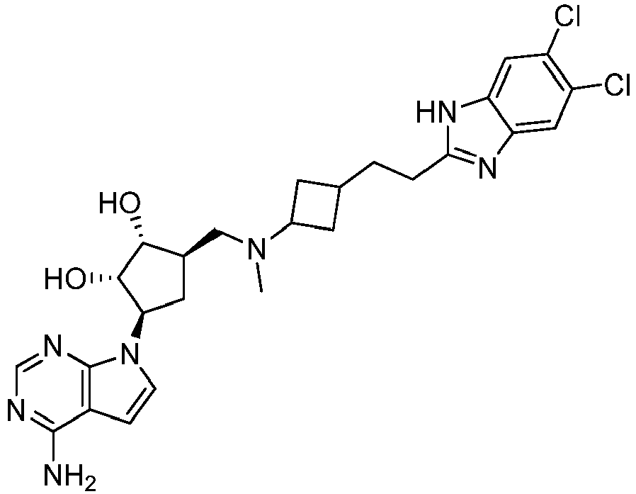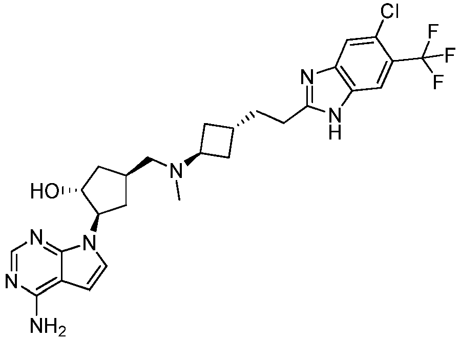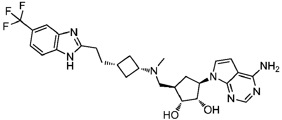 - VTATZTWDYXBGSJ-SNCDATCWSA-N CN(C[C@@H](C[C@H]([C@@H]1O)[n]2c3ncnc(N)c3cc2)[C@H]1O)C(C1)CC1c1nc2cc(Cl)c(C(F)(F)F)cc2[nH]1 Chemical compound CN(C[C@@H](C[C@H]([C@@H]1O)[n]2c3ncnc(N)c3cc2)[C@H]1O)C(C1)CC1c1nc2cc(Cl)c(C(F)(F)F)cc2[nH]1 VTATZTWDYXBGSJ-SNCDATCWSA-N 0.000 description 1