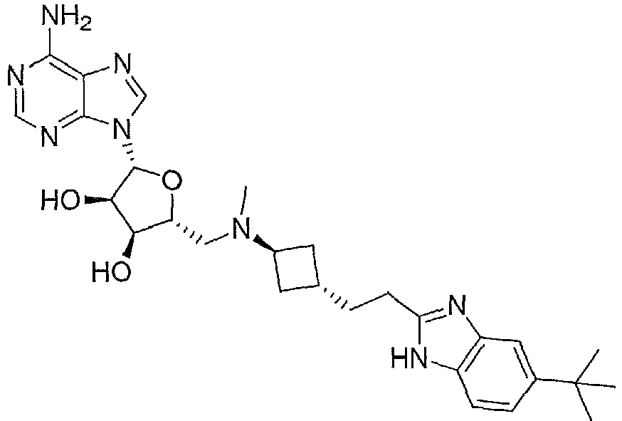 - MXAHCODTQFMJSL-VOZPHJQPSA-N CN(C[C@@H](C[C@H]([C@@H]1O)N2c3ncnc(N)c3CC2)[C@H]1O)[C@H]1C[C@H](CCc2nc(cc(C(F)(F)F)cc3)c3[nH]2)C1 Chemical compound CN(C[C@@H](C[C@H]([C@@H]1O)N2c3ncnc(N)c3CC2)[C@H]1O)[C@H]1C[C@H](CCc2nc(cc(C(F)(F)F)cc3)c3[nH]2)C1 MXAHCODTQFMJSL-VOZPHJQPSA-N 0.000 description 1