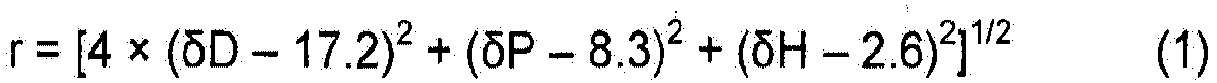 - HSP are ones having the solubility parameter introduced by Hildebrand divided into three components of dispersion parameter ⁇ D, polar parameter ⁇ P and hydrogen bonding parameter ⁇ H and represented in three-dimensional space.