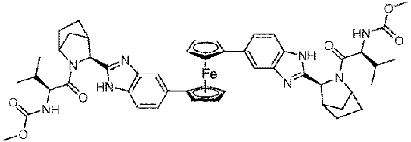 - SPRFTXKEVUPMAF-XFKFUYTMSA-N CC[C@H](C)C(C(N(CCC1)[C@@H]1c1nc(CC(C=C2)C3=CC(CC4)=CCC3CCc3ccc4c(-c4ccc5[nH]c([C@H](CCC6)N6C(C([C@@H](C)CC)NC(OC)=O)=O)nc5c4)c3)c2[nH]1)=O)NC(OC)=O Chemical compound CC[C@H](C)C(C(N(CCC1)[C@@H]1c1nc(CC(C=C2)C3=CC(CC4)=CCC3CCc3ccc4c(-c4ccc5[nH]c([C@H](CCC6)N6C(C([C@@H](C)CC)NC(OC)=O)=O)nc5c4)c3)c2[nH]1)=O)NC(OC)=O SPRFTXKEVUPMAF-XFKFUYTMSA-N 0.000 description 1