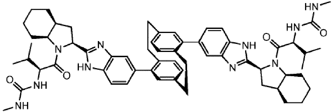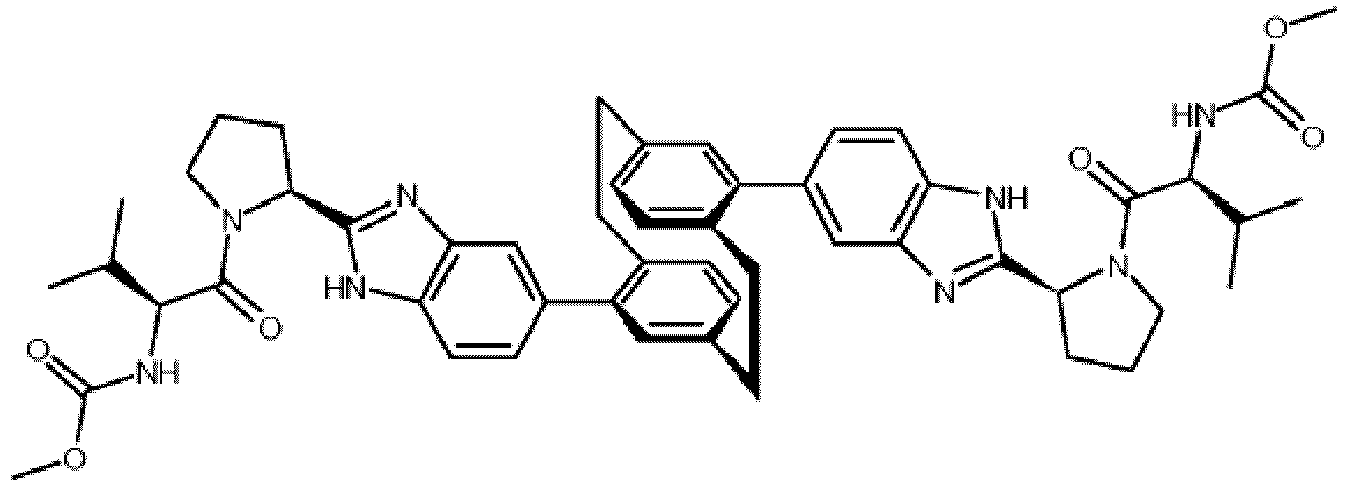 - QRMIIBLCGXDBGB-UCBUOYTKSA-N CC(C)[C@@H](C(N(CCN(C1)S(C)(=O)=O)[C@@H]1C1(C)Nc2cc(C(C3)=C(CCc(cc4)c5)C=C[C@H]3C[C@@H](C)c4c5-c3ccc4[nH]c([C@H](CN(CC5)S(C)(=O)=O)N5C([C@H](C(C)C)NC(OC)=O)=O)nc4c3)ccc2N1)=O)NC(OC)=O Chemical compound CC(C)[C@@H](C(N(CCN(C1)S(C)(=O)=O)[C@@H]1C1(C)Nc2cc(C(C3)=C(CCc(cc4)c5)C=C[C@H]3C[C@@H](C)c4c5-c3ccc4[nH]c([C@H](CN(CC5)S(C)(=O)=O)N5C([C@H](C(C)C)NC(OC)=O)=O)nc4c3)ccc2N1)=O)NC(OC)=O QRMIIBLCGXDBGB-UCBUOYTKSA-N 0.000 description 1